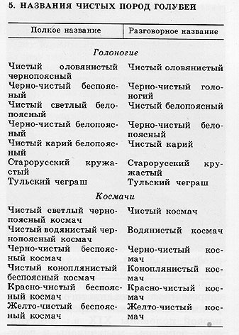 В разговорном лексиконе чистых называют в сокращенной форме, не дающей полного представления о голубе. Согласно классификации для чистых пород голубей предлагается полное их название (табл. 5).