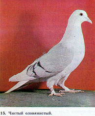 Чистые оловянистые чернопоясные (рис. 15). Свое название птицы получили за цвет окраски щитка крыла, который похож на цвет олова на разрезе. Оловянистые голуби выведены в середине XVIII в. от ярославских породных линий Козина и Аршукова, в последующем при формировании современного оловянистого приняли участие московские породы чистых первой половины XIX в.: лакутинские, репуновы, мальчиковы и перуны. В 1900 г. впервые был опубликован стандарт на чистого оловянистого голубя, который уточнен в 1913 г.
