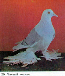 Чистые светлые чернопоясные космачи (рис. 20). Эти голуби плохо летают и в основном их разводят как декоративных, встречаются лишь отдельные экземпляры летунов. Космачи имеют сухую крепкую конституцию, птицы спокойные, хорошо высиживают и выкармливают птенцов, жизнеспособны. Из-за сильно оперенных ног птиц необходимо содержать в просторном, сухом питомнике и внимательно следить за их состоянием.