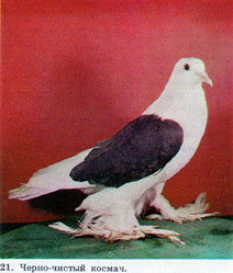 Черно-чистые беспоясные космачи (рис. 21). В начале формирования этой линии голубей называли кружастыми бархатными космачами. Создание космачей с чисто-черным щитком длилось более века. Благодаря талантливому московскому голубеводу А. М. Злоказову в начале XX в. был создан черно-чистый космач. Вначале они имели две линии: - первая - космач со щитком ярко-черного (вороного) цвета с темными перьями в пахах, заходящими в откосы и красно-желтыми глазами (скороглазые); вторая - с менее выраженной яркостью цвета черного щитка, но без пахов и нередко с темными глазами. В дальнейшем по инициативе А. М. Злоказова московские любители космачей совместили эти две линии и путем прилития крови темно-синих чернопоясных космачей были получены современные черно-чистые космачи. Этой породе космачей присущи все качества, которые имеют чистые космачи, только сплошной бархатно-черный щиток без поясов определил голубям такого типа свое самостоятельное место в группе космачей по классификации.