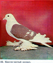 Красно-чистые беспоясные космачи (рис. 22). Порода выведена талантливым московским голубеводом А. М. Злоказовым в конце 20-х годов. Создана она путем скрещивания коноплянистого космача с николаевскими, которые имели красный щиток. Получились голуби с типичным строением тела и оперенностью ног для космачей, но имеющие красно-алые сплошные щитки. Кровь николаевских голубей повлияла также на форму головы, она стала более округлая и широкая. В дальнейшем любителями Москвы выведена новая линия красно-чистых космачей с более характерными признаками чистых космачей, но была утрачена яркость окраски щитков. Работа по усовершенствованию этой породы продолжается. Все качества и породные признаки красно-чистого космача должны соответствовать требованиям стандарта для чистого светлого космача, кроме цвета щитков.