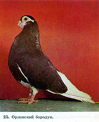 Орловские бородуны (рис. 25). В 70-80-е годы XVIII в. крепостными графа А. Г. Орлова были выведены орловские бородуны, или орловские черные турманы. Название "орловские" птицы получили по фамилии хозяина, а "бородуны" за белое подклювье (бороду).
