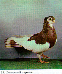 Ленточные турманы (рис. 27). Одна из старейших русских пород короткоклювых турманов. Родина птиц г. Ржев, который когда-то называли "голубиным сердцем". В XVII в. ржевские ленточные были гордостью голубеводов Ржева и их начали распространять по городам нашей страны. Свое название "ленточный" они получили за поперечную белую ленту на красном фоне хвоста. Голубей с красной грудью и чисто белыми крыльями называли пегими, имеющих несколько маховых перьев белого цвета,- красно-пегими; с пестротой на крыльях - жемчужными. Основное внимание уделялось летным качествам голубей и миниатюрности телосложения. Точных данных о происхождении ржевского ленточного нет. Как предполагает Н. А. Васильев, в создании этой породы принимали участие орловский белый и жарый турман.