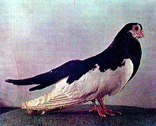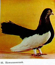 Камышинские (рис. 41). Статные вислокрылые голуби с двухцветной окраской сорочьего рисунка. Любители называют птиц этой породы иногда просто "камышами". Птицы прекрасные летуны, летают на большой высоте, кругами, полет продолжительный, групповой или в одиночку. Они очень привязаны к дому, хорошо ориентируются и почти никогда не теряются. Эти голуби имеют высокую жизнеспособность, плодовиты и неприхотливы. Ранее птицы имели довольно короткий, толстый, темно-рогового цвета клюв, изредка белого.