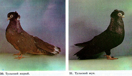 Тульские жуки (рис. 31). Родина птиц г. Тула, а название "жук" они получили за черную (смоляную) окраску. Конкретных сведений о происхождении породы нет. Имеется предположение, что в создании тульского жука принимали участие смоленские чубатые грачи-лобачи черного цвета. Жуков, как турманов, следует разводить для систематического гона, однако большинство любителей содержат их в качестве декоративных. В результате голуби имеют слабые летные способности, изнеженность, пониженную жизнеспособность и плохие выводковые качества. При их разведении для птенцов требуются кормилки и улучшенные условия содержания. После Великой Отечественной войны остались единичные экземпляры жуков, в основном с утраченными типичными чертами русских короткоклювых турманов. Наиболее распространены и популярны они были у себя на родине в Туле.