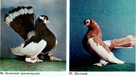 Волжские красногрудые (рис. 36). Породу сформировали в городах средней Волги в начале XX в. на базе ржевских, казанских трясунов, цветных качунов Северного Кавказа и отнесли к группе трясунов. Птицы плодовиты, хорошо высиживают и выкармливают птенцов. Отдельные экземпляры неплохо летают. Полет круговой на большой высоте. Голуби средние (чем меньше, тем лучше), имеют впечатляющий контур, близкий по форме к качунам. Голова округлая, средняя, гладкая (без чуба). Глаза средней величины. Радужная оболочка телесно-розовая с крапинками более темного цвета, зрачок темный; веки узкие, светлые. Клюв средний, утолщенный у основания, телесно-розовый, хорошо сомкнут; восковица слабо развита, белая, гладкая. Шея не длинная, полная, к голове сужается, красиво выгнута, птицы трясут ею. Грудь широкая выпуклая. Спина короткая, широкая в плечах, снижающаяся к хвосту. Крылья состоят из широких, упругих маховых перьев, концы их опущены ниже хвоста и почти касаются земли. Хвост из 14-18 широких рулевых перьев, веерообразный, плоский, немного укорочен и сильно приподнят. Ноги короткие, средне оперенные (3-6 см); когти телесного цвета. Оперение вишнево-белое. Вишневые голова, шея, грудь, спина, надхвостье и хвост. Белые щеки до линии середины глаз, подклювье, горло (борода) 1-2 см, крылья, брюшко и ноги. Поперек хвоста, отступя от конца 5-10 мм, проходит белая полоса (лента) шириной 10-20 мм. Окраска должна быть сочной, ровной и блестящей. Шея и грудь с фиолетовым блеском (отливом). Изредка встречаются голуби желтые с белой лентой на хвосте.