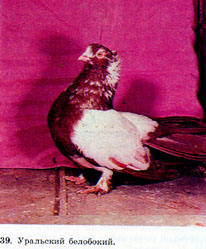 Уральские (рис. 39). В городах Среднего и Южного Урала на базе местных пород и ряда статных голубей Северного Кавказа была сформирована самостоятельная порода уральских белобоких. Точных данных о создании этой породы нет. Она пока малочисленна и не распространена среди любителей, за исключением Урала и Казахстана. Уральские птицы статные летно-декоративные голуби-трясуны. Летают средне, в большинстве случаев содержатся как декоративные. К условиям содержания неприхотливы, жизнеспособны, плодовиты, хорошо высиживают и выкармливают птенцов.