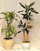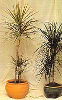 Dracaena marginata (Драцена окаймленная, справа) и D. m. "Tricolor" (Д. о. "Трехцветная"). |