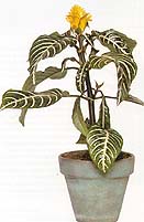 Хотя его правильное название А. пиктум, вы, вероятнее всего, найдете его в продаже под этим традиционным названием. Часто выращивают его пестролистную форму "Thompsonii" с желтыми пятнами на листьях и бледно-оранжевыми цветками.