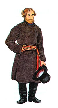 Бедные люди никогда не шили длинных одежд, так как они не были приспособлены к ходьбе по довольно грязным городским улицам. Эту особенность и отметила народная пословица: «Одежка вряд (то есть средней руки) не обобьет пят!» Повседневной зимней одеждой крестьян и ремесленников были овчины и полушубки, выше колен и застегивающиеся на крючья. Они шились с широким запахом, с меховым воротником-стойкой и отделкой мехом. Зимой в дорогу надевали длинные теплые тулупы (то есть кожаные мешки) и кожухи. Тулупы крыли тканями, стараясь показать достаток семьи.