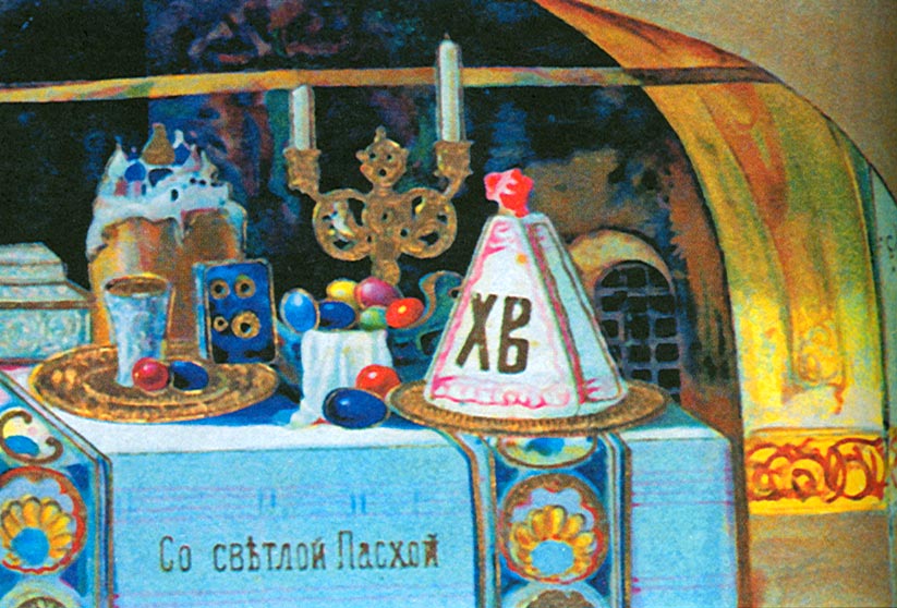 Вся еда в этот праздник имела ритуальное значение и освящалась в церкви: крашеные яйца, высокий круглый хлеб из пшеничной муки — пасочен хлеб, или кулич, и творожная пасха.