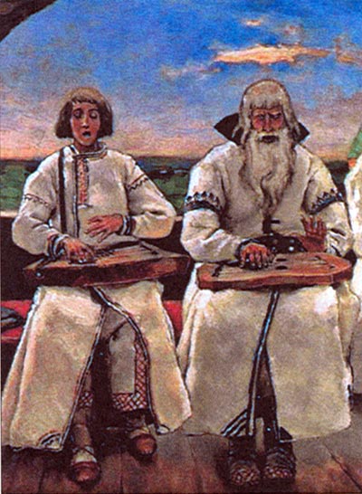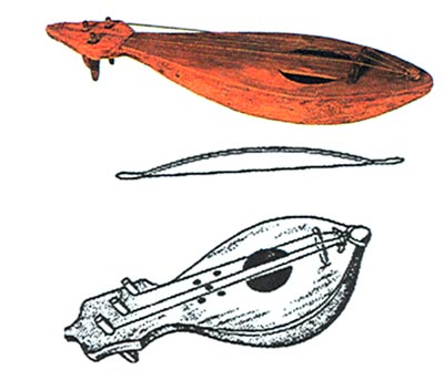 Древнейшим инструментом были гусли. Само название происходит от древнеславянского «густы» — гудеть. Так как гудела струна, то ее назвали «гусла», а много струн — гусли, то есть гудящие струны. Гусли состояли из специально выдолбленного елового (или соснового) корытообразного корпуса в форме крыла, покрытого сверху тонкой деревянной или кожаной пластинкой — декой (дека — крышка). Именно дека заставляла колебаться воздушное пространство, усиливая звук, делая его более продолжительным и полным. Деку делали из явора — клена, отсюда словосочетание «гусли яровчатые» (искаж. от «яворчатые»). Струны (от четырех и более) были жильными или медными. При игре инструмент клали на колени и перебирали струны пальцами обеих рук. Пальцами правой руки исполнитель защипывал струны или ударял по ним, пальцами левой — глушил ненужные звуки.