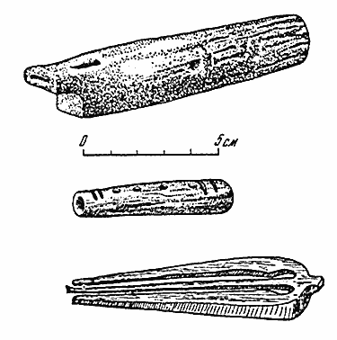 Верхние концы ее стволов были открыты (в них дули), а нижние — закрыты пыжами, воском, камешком. Звук извлекался посредством рассечения струи воздуха о край верхнего конца трубочки. На таких инструментах, приплясывая, одновременно играли три-четыре женщины.