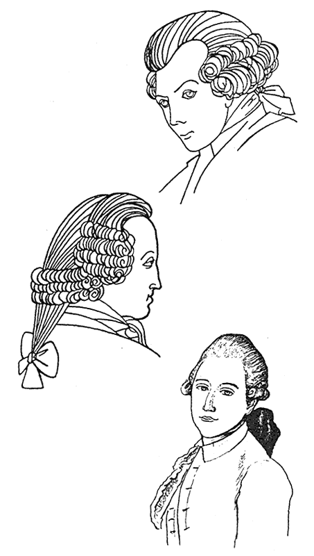 Прически со временем менялись. Если в начале XVIII в. были модны прически с париками типа «пудель» или «львиная грива», то в середине века им на смену пришел парик с косичкой и буклями на висках. Это так называемая прусская коса, которую вначале делали на своих волосах, а затем на париках. Справа и слева волосы стали укладывать горизонтальными буклями над ушами. Во второй половине века появилась прическа «крысиный хвост». Боковые пряди завивались и взбивались в одну или две горизонтальные букли, плотно закрепленные у каждого виска. Затылочные волосы гладко зачесывали и обматывали кожаным ремешком или муаровой лентой, образуя длинный жесткий стержень. Завивали волосы так: пряди заворачивали в бумагу и накручивали на горячие щипцы. Щеголи жалели бумагу на письма и экономили ее для завивки. Голову посыпали ароматизированной пудрой — крахмалом с душистыми добавками, но букли не пудрили. Парики пудрили и надевали в официальной обстановке. Сначала носили две букли, в середине века — три-четыре, а затем опять одну-две. Несколько буклей закрывали уши, а с 80-х гг. опять их укладывали над ухом. Взбитые, завитые или гладкие волосы зачесывали со лба назад, сзади заплетали косу и обматывали ее лентой. На косу надевали небольшой мешочек — «кошелек» из черной тафты или бархата, позже черной сетки, закрепляли его черным шнурком или лентой у основания косы, затем прикрепляли на затылке большой бант из черной тафты. Конец ленты, которой обвязывали косу, можно было обернуть вокруг шеи, поверх белого галстука.