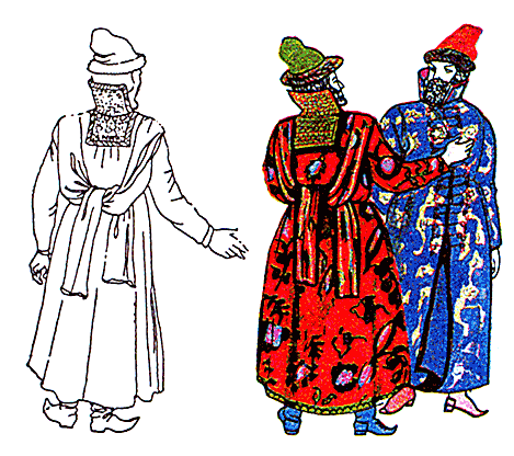 Шубы шили обязательно мехом внутрь и обыкновенно сверху покрывали сукном или шелком. По бокам разреза спереди пришивали нашивки, которые отличались от материи самой шубы. На них нашивали петли и пуговицы, а сам разрез окаймляли металлическим кружевом. Шубы обычно были в старину широкими распашными и длинными, с отложными воротниками. Турские (то есть турецкие) шубы отличались двойными рукавами — для рук и украшения. На исходе XVII в. появились еще шубы польские, без воротников, петлиц и пуговиц, они застегивались у шеи запонами и имели просторные рукава. Различали также шубы нарядные — для выходов и санные — для дороги. Санные шубы обыкновенно были нагольными, то есть не покрывались сверху материей. Вкусы того времени требовали ярких цветов — чем ярче, тем больше уважения. Черные и темные тона использовались лишь для траурных одежд. Любимыми цветами знати был червчатый (красно-фиолетовый), лазоревый (голубой), зеленый, желтый, шафранный, кирпичный, сливный (темно-синий).