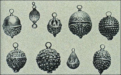 Самой дорогой и модной вещью в костюме допетровского времени была пуговица. Слово произошло от древнерусского «пуговина», имеющее значение: возвышение, горб. Пуговицы были тогда крупные, выпуклые, рельефные. Они изготовлялись из золота, серебра, хрусталя, меди, дерева, обтягивались тканью или обвивались канителью. Пуговицами украшали не только одежду, но и ожерелья-воротники, существовал даже термин «ожерельные пуговицы». На Руси были сделаны самые крупные пуговицы размером с куриное яйцо. В то время были популярны пуговицы-кляпыши в виде удлиненных палочек из серебра с золочением, обвитые шелками или драгоценной проволокой. Все кляпыши были шарообразной формы. Пуговицы украшали эмалью, чеканкой и сканью. Для торжественных случаев использовали пуговицы из крупных сверленых драгоценных камней. |