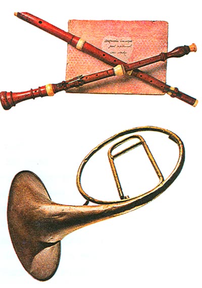 Музыка на ассамблеях первоначально была духовая: трубы, фагот, гобои, валторны; иногда литавры и тарелки. В 1721 г. появился оркестр. Трубы и валторны — излюбленные инструменты петровского времени. У валторн мягкий и красивый тембр и приятное звучание услаждали не только ассамблеи, но и прогулки в парках и на воде. Из-за границы выписывали музыкантов, а туда посылали учиться музыке крепостных.