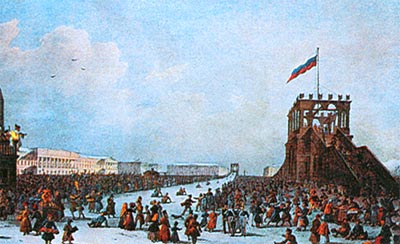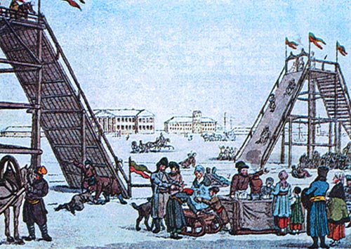 По старой русской традиции на Масленой и Пасхальной неделе в столицах стали возводить ледяные горы. В Петербурге они возводились на льду Невы в разных местах. Обычно катальных гор было две: они располагались параллельно скатами навстречу друг другу. Горы сооружались из больших бревен, имели лестницу и крутой дощатый скат до 18 метров. По обеим сторонам гор ставили елки, флажки и деревянные скульптуры. Катались все сословия. Использовали санки и лодки, обитые сукном с изображением льва или лебедя. Санки пролетали с большой скоростью, поэтому для безопасности наверху горы устанавливали перила. Для светских людей подобные развлечения являлись не столько пристрастием к острым ощущениям, сколько непременным представительством: посещение дворянами народных праздников было обязательным и считалось хорошим тоном. Они были настолько популярны, что даже когда не было снега, на Пасхальной неделе, в последней трети XVIII в. стали возводить «летние» катальные горы: по деревянным спускам ездили по желобам на маленьких колясках с медными колесами. Вместе с горами сооружали маховые, круглые и подвесные качели.