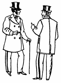 Часы помещали в нижнем кармане жилета, а цепочку продевали сквозь его петлю или прикрепляли колечком. Некоторые мужчины прикрепляли брелоки, печатки, карандаши, но это не считалось признаком хорошего вкуса. Франтоватые мужчины носили монокли. Прямоугольный или круглый монокль в тонкой черепаховой оправе с колечком носили на черном шелковом шнурке, надетом на шею. Монокль можно было опустить в нагрудный карман, который находился слева, но обычно он свисал на шнурке на грудь. На таком же шнурке, надетом на шею, носили и пенсне в черепаховой или металлической оправе. Трости носили черные с серебряной или костяной ручкой.