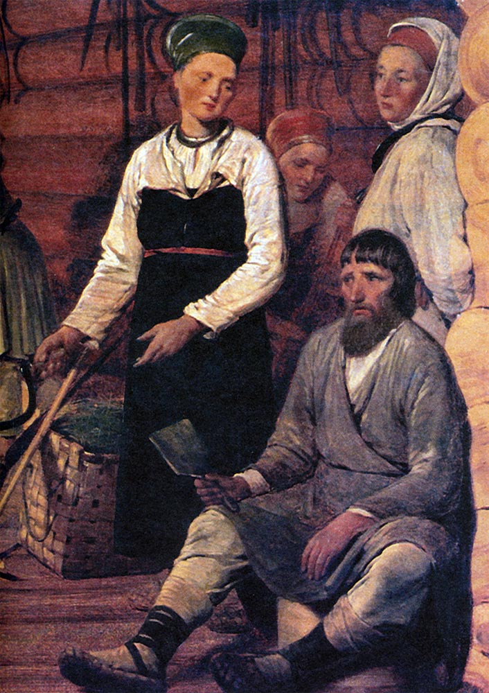 Крестьянская одежда состояла из рубахи, пестрядинных штанов, кафтана и картуза. Верхним платьем был кафтан. Первый был основной верхней одеждой, а второй носили при плохой погоде. Эта одежда была халатообразная и отрезная. Цвета крестьяне предпочитали темные — зеленый, синий, коричневый, серый. Праздничный наряд был более яркой расцветки, тем более что теперь ткани окрашивали. Надевали и «городские» детали костюма. Обувью служили лапти, постолы, сапоги и валенки.