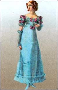 Бальные платья в 20-е гг. шили из тафты или бархата, с прилегающим лифом, открытым на плечах и спереди, сзади широкие рукава нередко делали из газа. Юбка украшалась оборками из того же материала, что и рукава. Шляпы на балах носили атласные с бархатом, шелковыми бантами и белыми страусовыми перьями на затылке. Перчатки, браслеты, шали и нитки топаза или агата дополняли нарядный костюм.