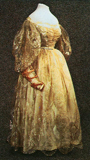 Рукава настолько были огромными, что их сажали на каркас из китового уса или крахмальную подкладку, так как их сильно мяла верхняя одежда. Широкие короткие рукава на очень узкой манжете называли пагода (от фр. Ala pagode). В 40-е гг. в моду вошел рукав с буфом от локтя до кисти руки, в связи с этим талию женского платья удлинили, а на юбках стали делать большое количество сборок. В этом случае также создавалось впечатление тонкой талии. В моду вошло декольте, прикрываемое кружевом золотисто-желтого цвета, называемое блондой. Н. В. Гоголь дал великолепные описания дамы того периода в повести «Невский проспект»: «Кажется, как будто целое море мотыльков поднялось вдруг со стеблей и волнуется блестящею тучею над черными жуками мужеского пола», «А какие вы встретите дамские рукава на Невском проспекте! Они несколько похожи на два воздухоплавательных шара, так что дама вдруг бы поднялась на воздух, если бы не поддерживал ее мужчина».
