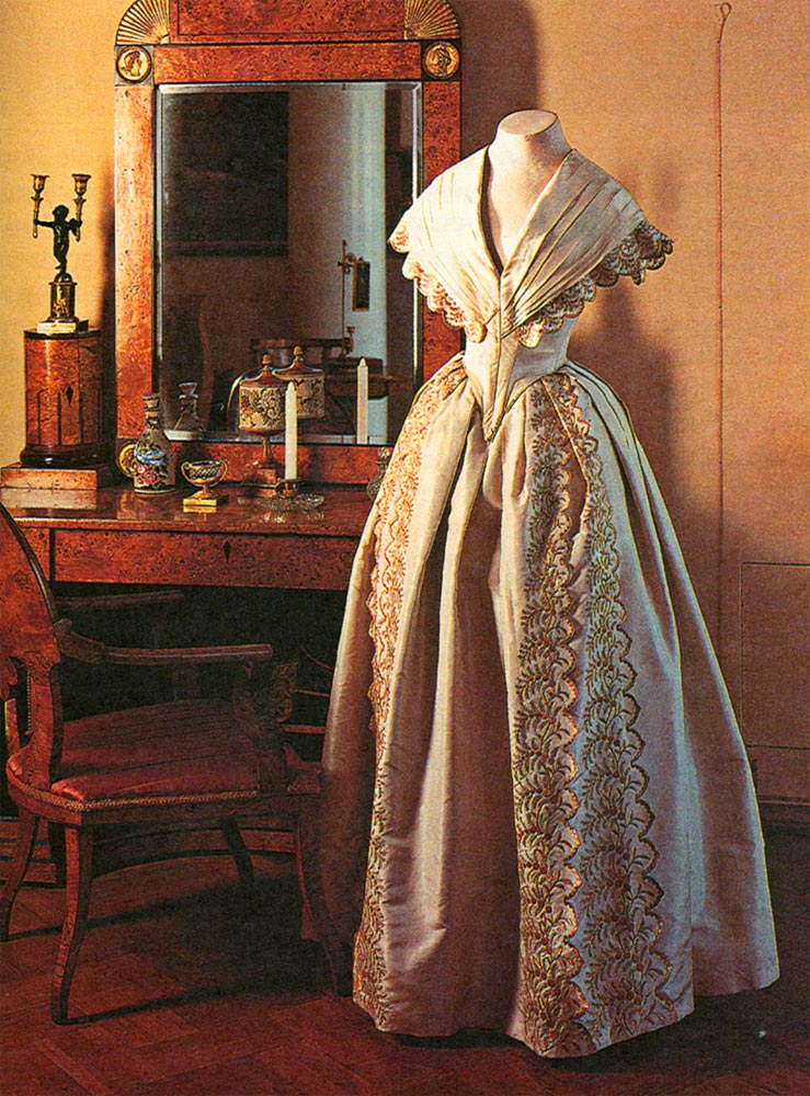 В это время были популярными домашние вечера — рауты. Хозяйка обычно надевала темное вечернее платье, блондовый или тюлевый чепец, черные кружевные митенки — перчатки без пальцев. Надевали и длинные шелковые или лайковые светлые перчатки, отделанные по краю рюшем или кружевом. К бальному туалету полагался и кисет — дамская сумка в виде мешочка, затягивающегося шнурком, расписной черепаховый или деревянный из павлиньих перьев веер. В 30-е гг. бальные туалеты шили из атласа, крепа, розового, голубого, салатного и сиреневого цветов, тафты, бархата и муара темных тонов. Светлые платья отделывали блондой и страусовыми перьями, темные — золотой блондой, боа, бархатными эполетами и светлыми газовыми рукавами, драпированными лифами, бантами на плечах. Юбки украшали бантами, оборками и гирляндами мелких цветов. Те же цветы были и в волосах. Длинные прозрачные рукава пришивали сверх основного рукава из плотной ткани.