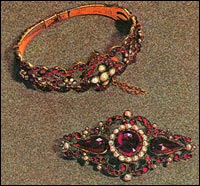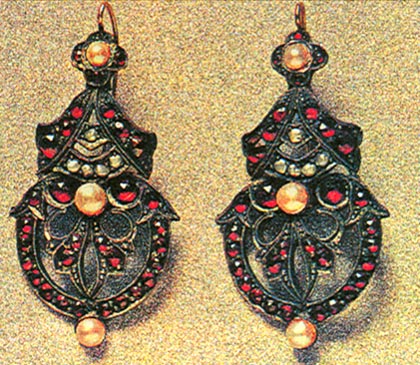 Модными считались украшения в русском стиле из цветных камней и эмали, с применением техники скани, а также отделки граненым стеклярусом. В русском стиле делали серьги, броши с подвесками, пряжки. В моде кольца с овальными или прямоугольными камнями в узкой оправе или в лапках, серьги с подвесками, серьги в виде двойного кольца с кораллами, бирюзой или жемчугом, бриллиантовые пряжки на бархотках. В украшениях была заметна тенденция к натуральным формам цветов, листьев, колосьев, пчел, мух, птиц.