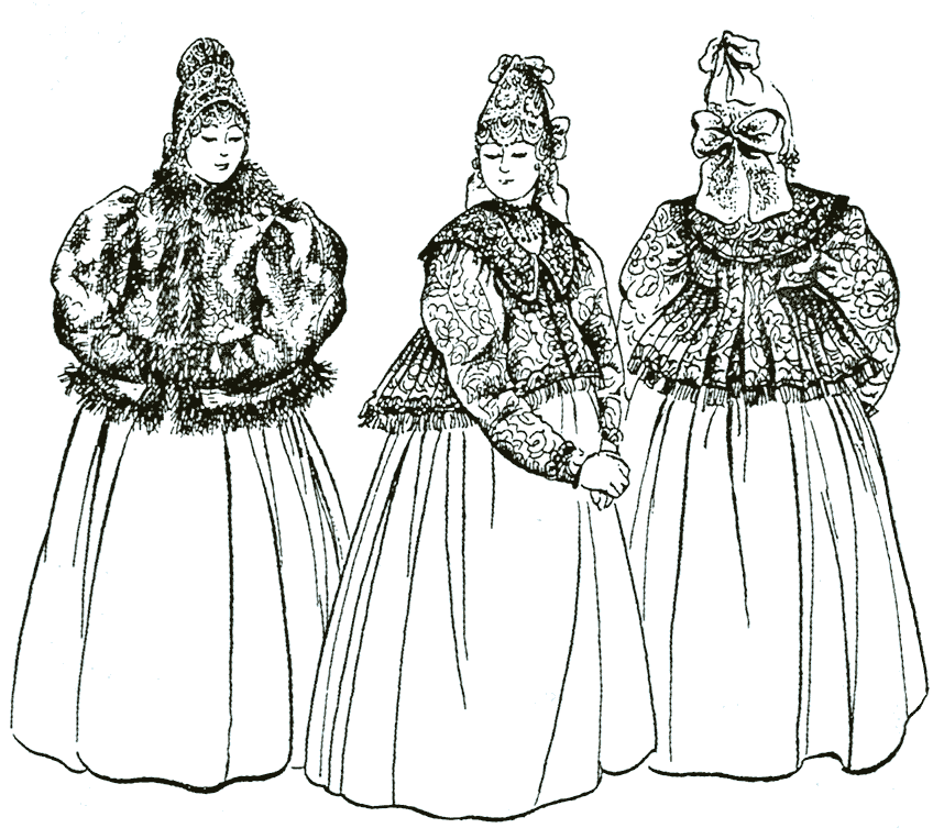 Верхней одеждой купчих были бархатные цветные салопы, богато украшенные — зимой мехом с большими собольими, куньими воротниками, весной и осенью — стеклярусом, сутажем, бахромой. Такие салопы носили и столичные, и провинциальные купчихи. Шили их с длинной пелериной из сукна, плюша, бархата, плиса и репса. К салопу полагался капор с лентами, богатая шаль, модные ботинки, полусапожки на каблуке.