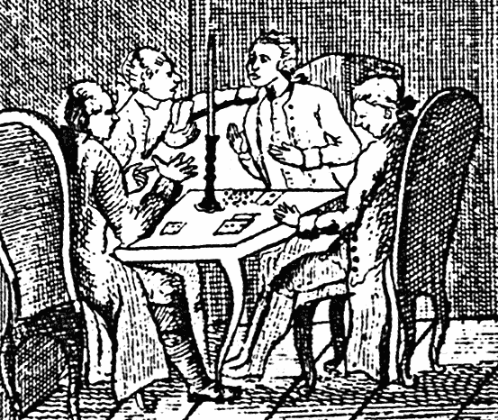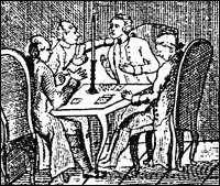 У прямоугольного стола, покрытого зеленым сукном, собрались игроки. Один человек раздавал карты, то есть метал банк, а другой записывал мелком на зеленом сукне количество денег, ставок и долгов. Начиналась игра в полном молчании. Она требовала выдержки, хладнокровия, сосредоточенности и достоинства. В этом смысле игра в карты была поединком, похожим на дуэль.