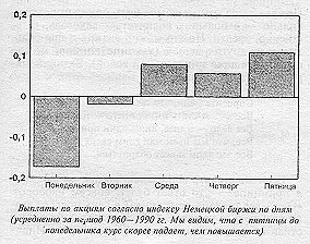 Эта точка зрения нередко высказывается по телевидению ретивыми биржевыми обозревателями, которые утверждают, что маклеры предпочитают в пятницу "свести все к нулю" и не оставлять на конец недели большое количество ценных бумаг. В этом случае курсы ценных бумаг к концу недели должны были бы падать.