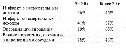 Но с ней соглашаются и научные исследования. Гарвардские медики проанализировали состояние здоровья 50 тысяч мужчин и обнаружили, что риск поражения коронарных сосудов оказался выше у непьющих людей по сравнению с теми, кто регулярно потребляет спиртное. Более того - риск сужения коронарных артерий снижался в прямой зависимости от количества выпитого (не принимая во внимание иные факторы, такие, как питание, кровяное давление, возраст и т.п.). Ниже приводится таблица (исследование, выполненное профессором Эриком Риммом), иллюстрирующая зависимость между риском поражения коронарных сосудов и потреблением алкоголя.