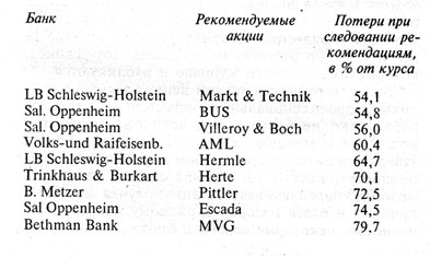 То же относится и к банкам. "Если кто-либо полагает, что можно следовать рекомендациям по покупке акций, которые публикуют банки Германии, ему надо держать ухо востро", - пишет журнал "Менеджер". Ниже приводится таблица, в которой документально представлена судьба некоторых таких рекомендаций. Данные журнала "Менеджер" на период июль 1991 - июнь 1992: