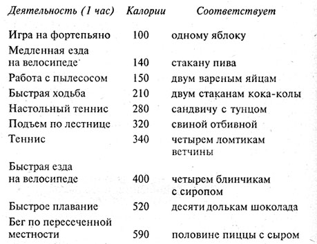Ничего подобного. Вопреки распространенному мнению, спорт и физическая работа не так уж сильно "сжигают" калории. Марафонская дистанция, которую преодолел посланец царя Федиппа, стоила ему всего лишь около 3 тысяч калорий - это примерно столько же, сколько получают читатели этой книжки после сытного обеда. Ниже приводится таблица примерного расхода калорий для мужчины весом 70 кг (для более плотных расход в калориях будет несколько выше, для людей полегче - ниже, женщины потребляют в среднем меньше калорий).