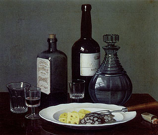 Натюрморт Волкова - это несколько вещей, специально организованных в компактную, законченную пирамидальную группу. Мотив, взятый художником, своеобразен для натюрморта того времени: чинно встали рядом друг с другом штоф, бутылка хереса и графинчик, рюмки, закуска - сыр и колбаса на простой белой тарелке, вилка, такая знакомая-презнакомая вилка, каких и сейчас много, и спички в бумажной обертке. Все это разместилось на краю темно-коричневого полированного стола на фоне серой гладкой стены. Никакой пышности и изысканности. Все просто, все почти прозаично. Здесь нечего воспевать и нечем, собственно, любоваться, но этот изображенный мир дорог художнику, это его мир, мир человека его круга. Отбор вещей и их облик жизненно конкретны и придают натюрморту особую выразительность. Изображая вещи с доступной ему мерой точности, художник сумел оценить и передать предметное своеобразие каждого цвета, специфику фактуры каждого материала.