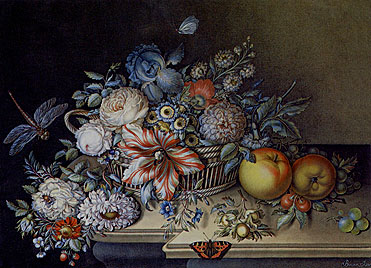 Художник следует традиционной схеме академического натюрморта, характерного для "цветочного класса с фруктами и насекомыми" - это яркий пример умения сочинить картину из необходимых элементов. Размещение предметов подчиняется академическим требованиям: в основе композиции - традиционный треугольник. Хорошо продумано освещение предметов. Главные достоинства картины - декоративность и графическая отточенность. Цвет локальный, в нем ценится его собственная красота. Каждая веточка, каждый лепесток изящно и в то же время точно вырисованы. Здесь нет места случайности. Пышные цветы и хорошо оттушеванные яблочки, однако, не смотрятся живыми. И зрителя не покидает ощущение некоторой "засушенности" и холодности этого натюрморта.