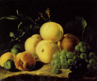 В первой половине XIX века встречаются натюрморты, построенные по традиционной схеме, но решенные более своеобразно, как, например, небольшая работа "Фрукты" В.А.Серебрякова. Фрукты расположены на столе-подиуме, в пирамидальной группе, на глухом темном фоне. Цвет локален, главные предметы выделяются более ярким цветом, композиция строится по декоративному принципу, на контрасте света и тени при условности характера освещения. Художник стремится как можно тщательнее прорисовать и выписать центральные предметы, иллюзионистически точно передать их фактуру. Мотив натюрморта - персики, зеленые сливы, виноград, бабочка, муха, капли росы - также весьма типичен и для академического, и для любительского натюрморта. Но решен он иначе, чем у Хруцкого и близких ему живописцев, - предметы взяты непосредственно вплотную, написаны мягче, тщательно вылеплены.