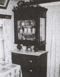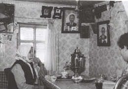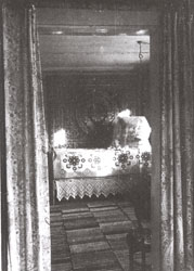 е – часть избы: передний поцвятный угол с иконами, обеденный стол в д. Вершина Вожегодского р-на. Фото С.Н. Иванова, 1986 г. |