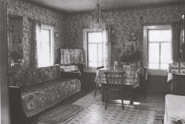 В Вологодском у. в то время, по обследованиям врачей-гигиенистов, оставалось много 60-100-летних крестьянских домов, представлявших собой тип изба с двором под одной крышей. Сохранялись и черные избы с двухэтажными дворами – изба-сени-поветь (сенник), с хлевами под избами – подполицами, голбцами. Высота такой избы равнялась 2,8 м, первого этажа – 1,5 м. Крыльцо с улицы вело в сени, взъезд на поветь устраивался сзади двора. Попытку приспособить первый этаж этих изб под жилье предприняли уже во второй половине XIX в. В появлявшихся белых избах реже, чем раньше, устраивали полати, пол красили краской, печь ставили ближе к середине избы, вся изба делилась на помещения – кухня, столовая, прихожая, гостиная (спален еще не было). Распространилась городская мебель, на окнах – занавески, стены часто обклеивались обоями[68].