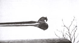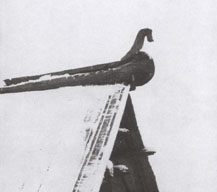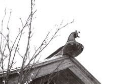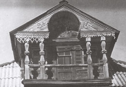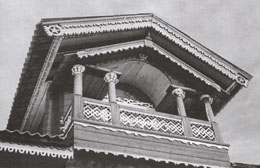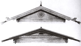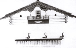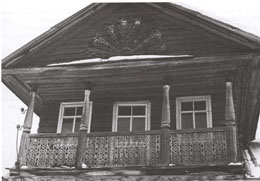 Резьбой нередко украшались крыльца, фронтоны изб, балконы, ворота усадеб. Особенно красивы были высокие крыльца с точеными столбиками и перильцами, крытые остроугольной формы крышами, а также крышами в виде полубочек и бочек. У самых старых изб крыши крылец оставались резными – в чешую. Округлые концы выступающих слег и бревен крыши избы (охлупня, куриц, повалов, водоспусков) могли украшаться скульптурной резьбой. На концах охлупней – князьков (треугольных брусов на верху крыши) вырезались деревянные коньки, птицы и другие украшения (Вологодский, Грязовецкий, Кадниковский, Вельский, Кирилловский уезды). Если крыша была двускатной, то конек находился на одном конце князька, если четырехскатной – на обоих его концах. Иногда коньки делали двухголовыми. На крышах построек в Грязовецком и Вельском уездах вместо конских голов вырубали головы птиц, а в Никольском у. – оленьи рога. Своеобразием отличалось украшение всего князька в постройках Сольвычегодского у. Из железа здесь вырезались фтгурки-мужички, скреплявшиеся по головам проволокой, и располагались вдоль князька[51].
