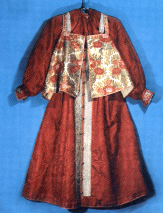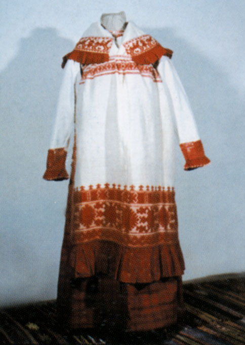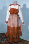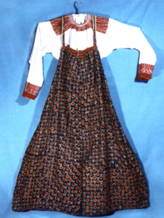 а - повседневный костюм из д. Холка Кичменьгско-Городецкого р-на: рубаха и сарафан из набойки (ВГМЗ 11418)