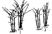 | Обрезка кустов ежевики с прямостоячими стеблями: 1 - перед обрезкой; 2 - после обрезки |