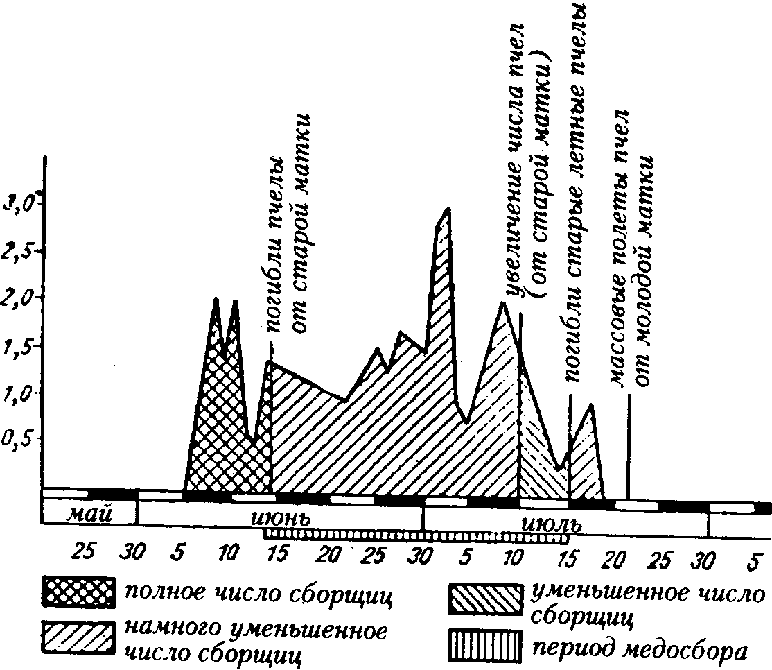 Рис. 18. Использование летнего медосбора роем, вышедшем