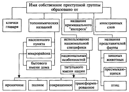 Процесс образования имен собственных асоциальных и криминальных групп имеет свои закономерности и в некоторой степени сходен с образованием индивидуальных кличек. Как кличка заменяет фамилию несовершеннолетнему, определяет его статус (стигматизирует его), подчеркивает его особенности, так и имена собственные преступных групп выполняют те же функции: выделения группы, определения ее места в межгрупповой иерархии и стигматизации (см. схему 10.1).