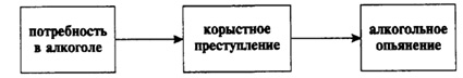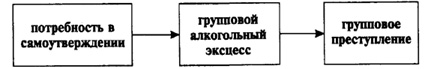 Особая связь групповой преступности несовершеннолетних с алкоголизмом. Связь эта многоканальная, прямая и обратная. Алкогольные эксцессы несовершеннолетних - это и способы "взрослого" самоутверждения, проведения досуга, свободного общения. Они - групповые по своему характеру. Едва ли можно встретить случаи, когда подростки употребляли алкоголь в одиночку. Им обязательно нужны зрители, аудитория, действия перед ней и составляют суть группового алкогольного эксцесса. Нередко ошибочно полагают, что есть лишь один механизм связи преступности несовершеннолетних с алкоголизмом, а именно - совершение преступлений в состоянии алкогольного опьянения, по формуле, приведенной на рис. 2.1.