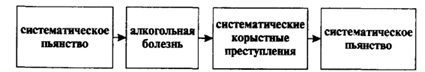 До настоящего времени в профилактике преступности недостаточно уделялось внимания четвертому механизму связи групповых преступлений несовершеннолетних с алкоголизмом, когда систематическое раннее употребление алкоголя ведет к интенсивному (ударному) развитию алкогольной болезни, сопровождающейся деградацией личности подростка, а дегради-руемая личность ищет себе подобных - группы деградирующих подростков - для систематического совершения корыстных преступлений: