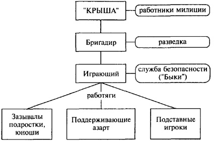 В проституции сложились четкие организационные структуры. 7-10 проституток составляют бригаду, во главе которой стоит сутенер (или сутенерша - "бандерша", сама, как правило, бывшая проститутка). Несколько бригад объединяются под одной "крышей". Так, в Москве, в Орехово этим бизнесом заправляет дагестанская группировка. Каждый такой преступный клан имеет своих охранников, посредников, своих хозяев квартир, свой автопарк, своих медиков и т.п. (см. схему 2.3).