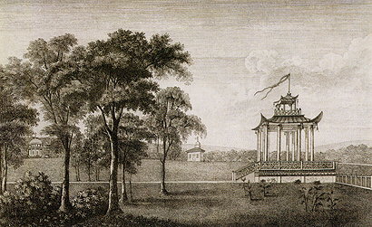 Гравюра эта, как, по-видимому, и следующая за ней литография (см. ил. 10), входила в альбомы с видами села Надеждино, принадлежавшего князю Александру Борисовичу Куракину, сыну сподвижника Петра I, князя Б.И.Куракина. В "Описании русских садов" было замечено: "Пример двора священ вельможам, богачам; во всех родилась страсть изящная к садам". Отличавшиеся роскошью парки имения Куракиных изобиловали всяческими увеселительными затеями и множеством прекрасных видов. Запечатлеть все эти чудеса приглашены были несколько ландшафтных живописцев, в их числе и Василий Причетников. На гравюре, выполненной по его акварели, изображена часть усадебного сада с беседкой в "китайском" стиле. Об увлечении "chinoiserie" ("китайщиной"), которым отмечено садовое искусство конца XVII века, уже упоминалось в связи с картиной М.М.Иванова (см. ил. 6).