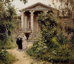 В 60-е и 70-е годы XIX столетия прежние "садово-парковые" мотивы исчезали вместе с угасанием былой усадебной жизни. Поленовская картина прозвучала на этом фоне своего рода отходной старинному русскому саду. Действительно, если раньше ухоженный, продуманный во всех деталях сад был настоящим произведением искусства, то теперь, заброшенный и запущенный, он потерял свое первоначальное назначение - эстетически услаждать, возвышать духом, дарить блаженство отдохновения. Поленовский сад, старый, заросший бурьяном, сам нуждается в помощи, "реанимации"; его уходящая жизнь едва теплится на маленьком пятачке клумбы. Этот сад "заперт", отделен от внешнего мира стеной усадебного дома. Композиция полотна замкнута: темные провалы открытой двери дома и подвального входа не зовут войти - их мрак непроницаем. Персонажи картины бредут от дома в неизвестность, их головы уныло опущены; Эти две фигуры - старухи и молодой девушки - придают картине оттенок жанровости, некий литературный подтекст, что позволило критикам уловить в произведении тургеневский дух.