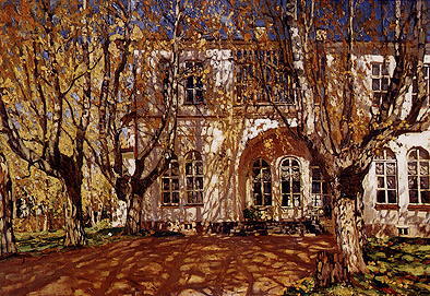 Этот красивый осенний пейзаж - один из большой серии пейзажей Жуковского с видами старых русских усадеб. Потомок старинного польского дворянского рода, Жуковский любил природу средней России, тонко чувствовал ее органическую связь с архитектурой безвестных провинциальных мастеров. Традиционна живописная манера художника. Его ностальгия облечена в привычные для глаза формы. Он лишь усиливает в своих пейзажах роль света, солнечных лучей. Оттого его "ностальгические" мотивы не вызывают чувства боли или тоски по ушедшему. В его парковых пейзажах всегда много солнца - вечернего закатного или утреннего, оставляющего на снегу и песочных аллеях сада длинные тени и теплые золотящиеся рефлексы. Жуковский не любит лета, ему ближе осенние, весенние, зимние дни, не любит он и полуденного солнца, предпочитая утро и вечер. "В старой аллее", по-осеннему золотисто-радостной, слышен отголосок, как бы шепот прошлой усадебной жизни; легкий прозрачный узор теней на стене дома и аллее от голых ветвей старых деревьев, напоминает о былой прохладе "темных аллей" усадебных парков.